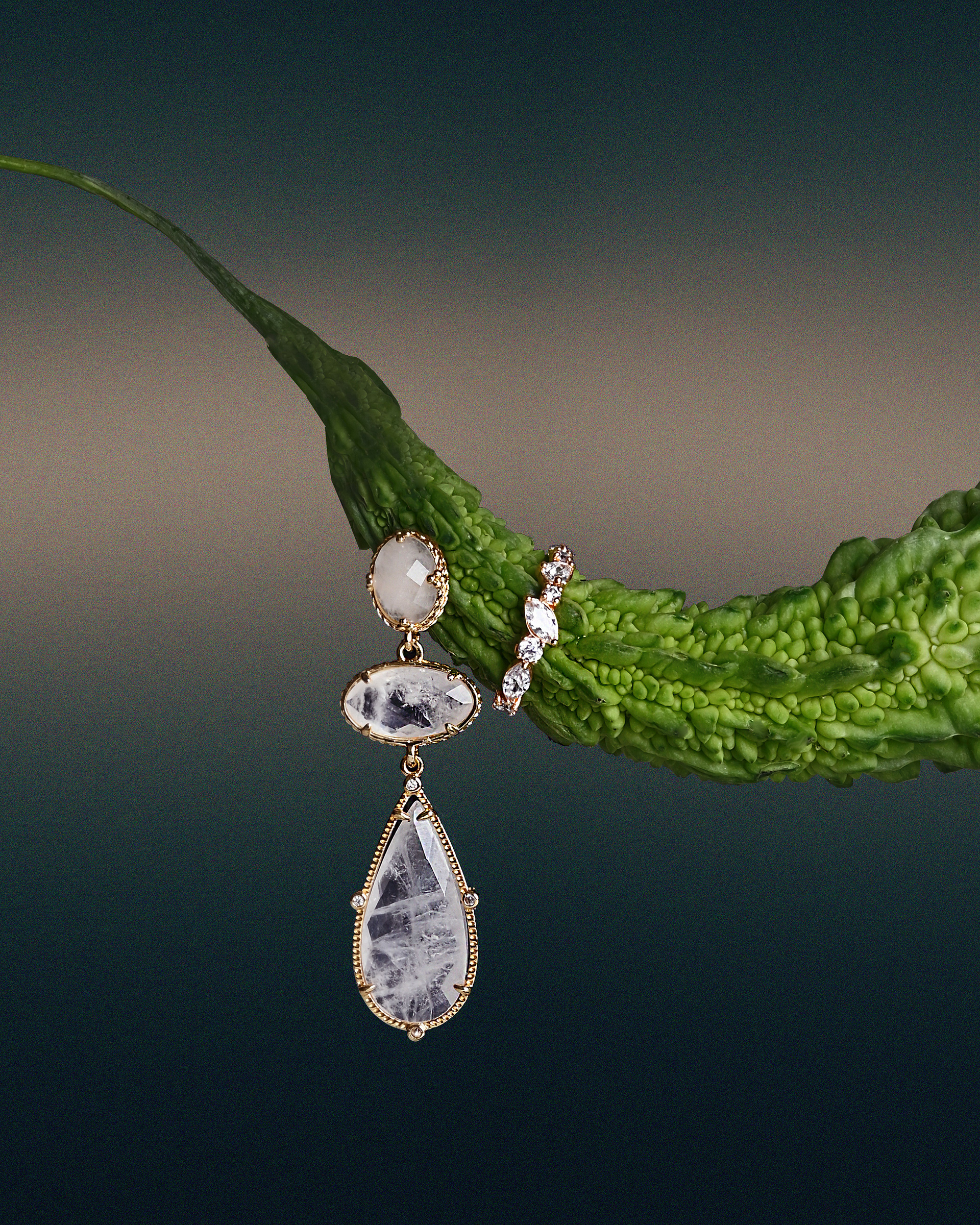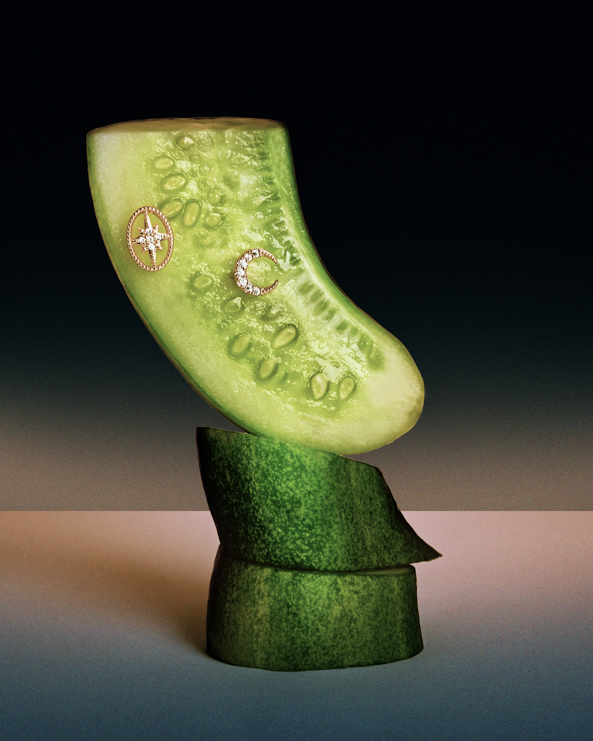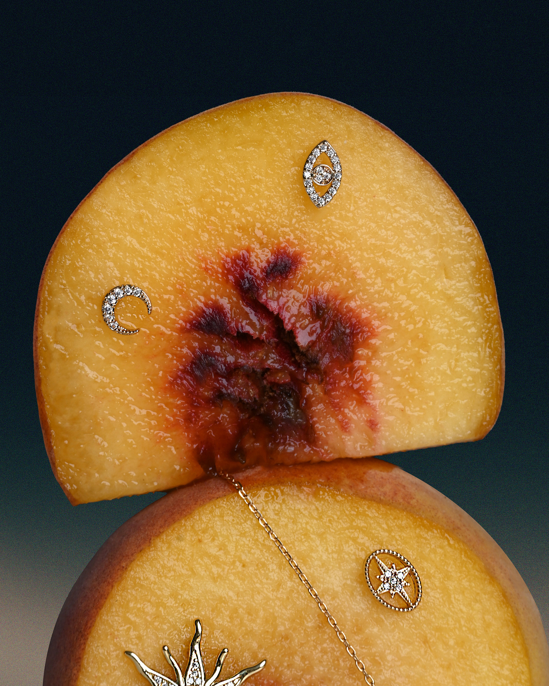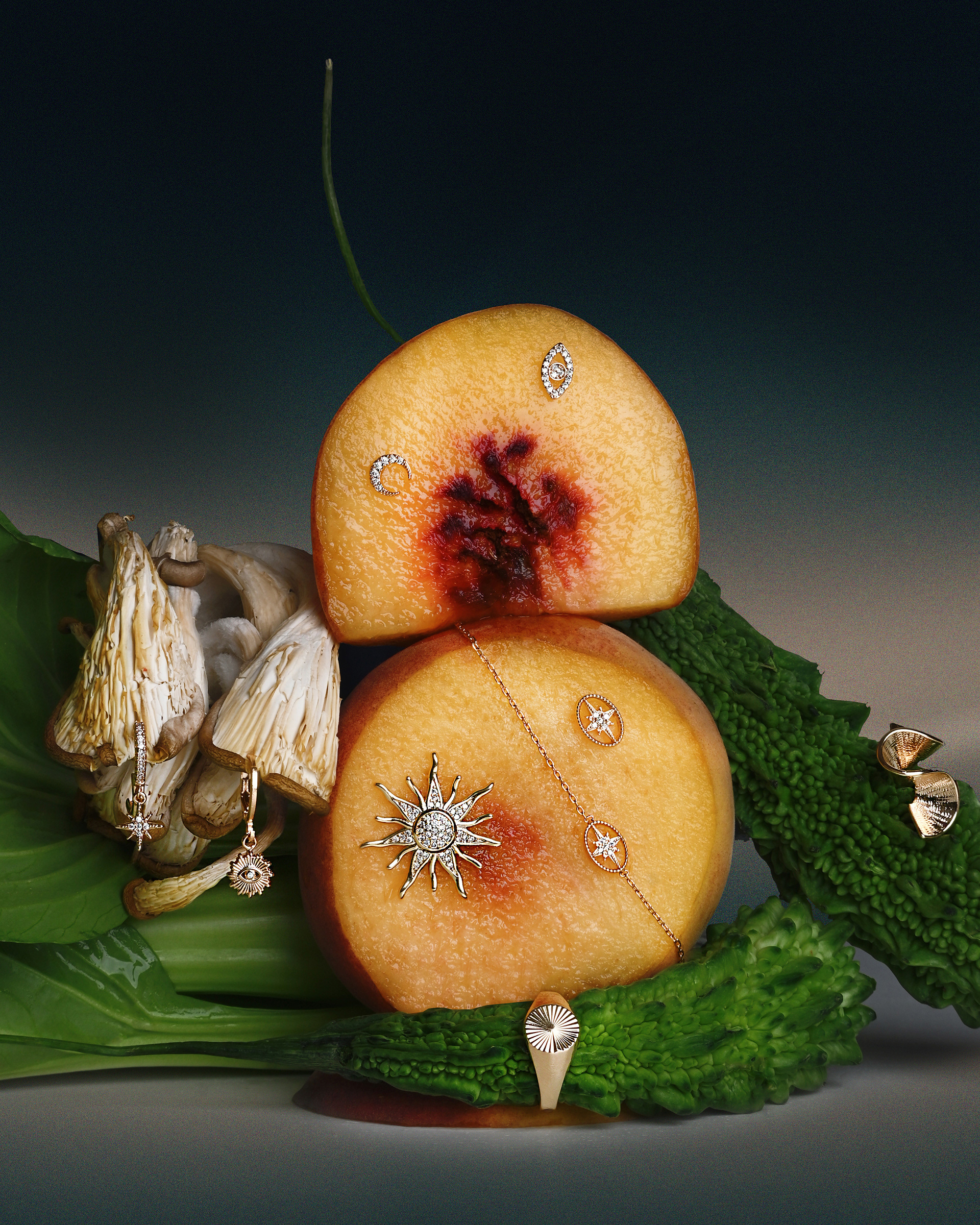 Combining natural elements, such as fruits and vegetables, with refined jewelry. This technique, rooted in classical painting, emphasizes textures, shapes, and contrasts between the organic and the luxurious.With carefully crafted compositions, the photos transform the jewelry into conceptual works of art, creating a visual narrative that bridges nature and sophistication.